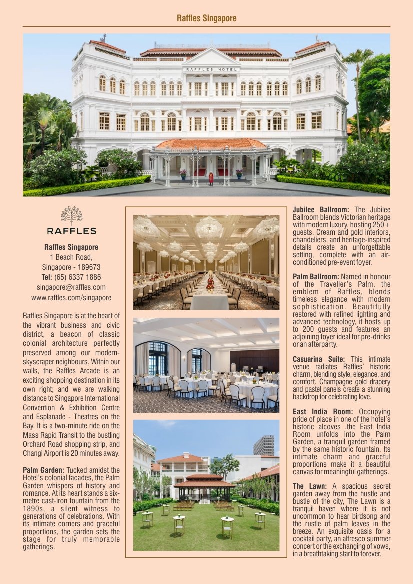 Casuarina Suite: This intimate venue radiates Raffles’ historic charm, blending style, elegance, and comfort. Champagne gold drapery and pastel panels create a stunning backdrop for celebrating love.
